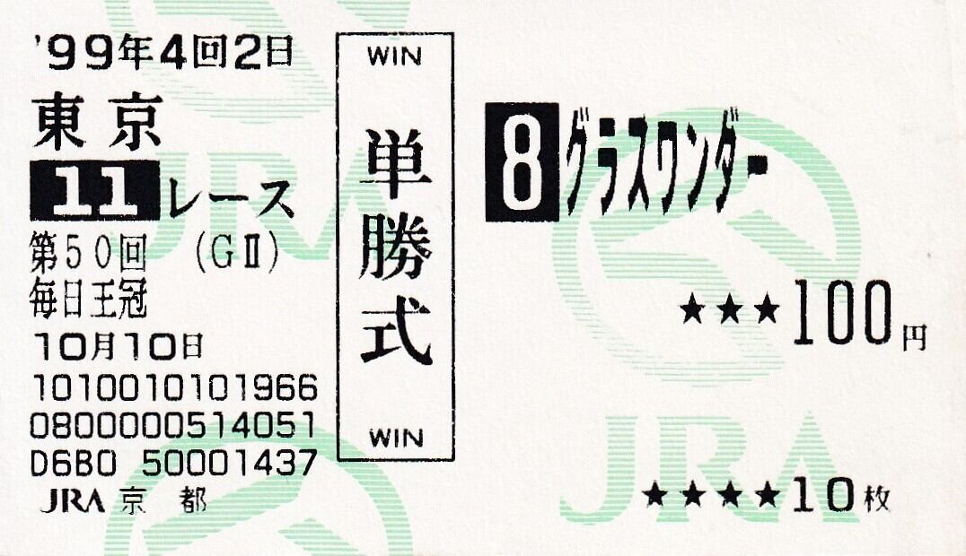 ※的中馬券 グラスワンダー:第50回 毎日王冠「他場 京都競馬場 当日購入馬券」単勝100円