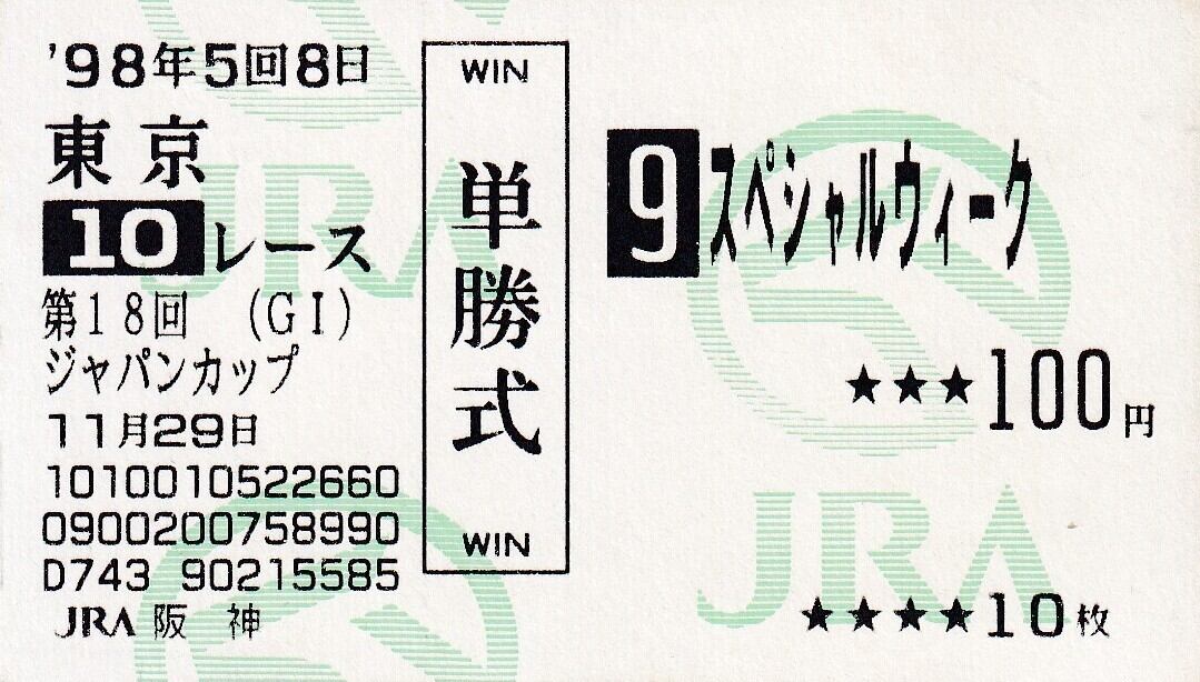 ※ハズレ馬券 スペシャルウィーク:第18回 ジャパンカップ「他場 阪神競馬場 当日購入馬券」単勝100円