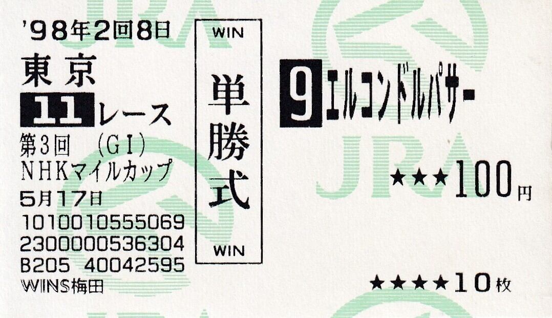 ※的中馬券 エルコンドルパサー:第3回 NHKマイルカップ「他場 ウインズ梅田 当日購入馬券」単勝100円
